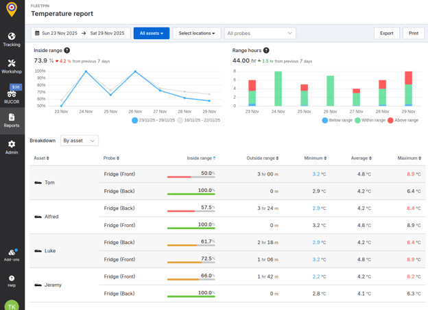 - You will see a summarised report of all the assets with the Temperature Monitoring Add-on. You can filter the report at the top by selecting a date range, assets, geofenced locations or configured probe types. This summary can also be exported by selecting the Export button at the top right, or printed with the Print button.