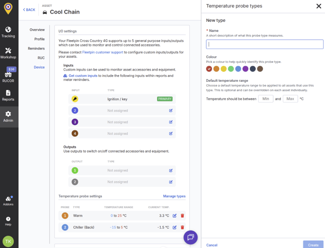 Before assigning probes to your assets, you’ll need to create the probe types (e.g., Freezer, Fridge).