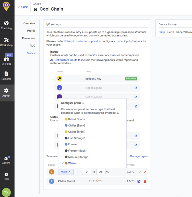 - Ensure a Fleetpin temperature probe has been installed in your asset.